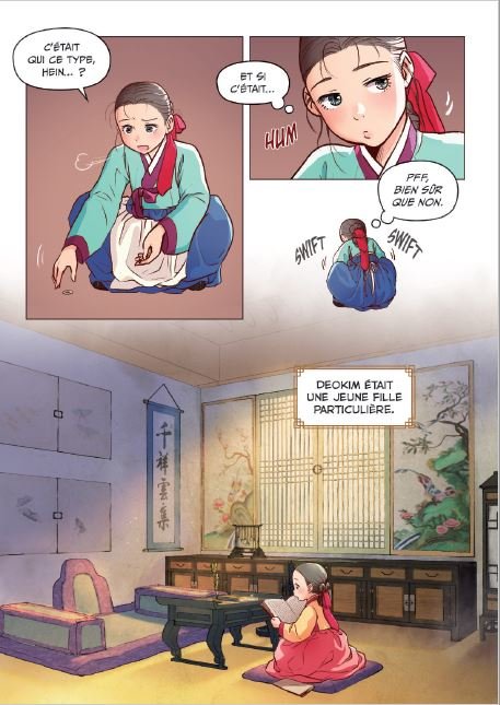Et j'ai passé un très bon moment avec ce premier tome. Je craignais un peu le côté enfermement au palais, comme dans Les carnets de l'apothicaire. Il n'en estrien pour l'instant, le personnage de Deokim étant assez différent : tout aussi intelligente mais beaucoup avenante, respectueuse mais très farceuse, tout en ayant un caractère bien trempé. En se concentrant sur son don pour la calligraphie et l'importance de l'éducation pour s'élever, on évite cet écueil. Forcément, ce premier volume pose le décor : on découvre les personnages, les relations entre eux et les luttes de pouvoir et complots commencent à peine à apparaitre. J'ai hâte d'entrer un peu plus dans le vif du sujet. Côté protagonistes, on sent bien sûr venir la romance, qui s'annonce difficile puisqu'ils sont de classes sociales différentes. On se doute que la demoiselle ne se laissera pas non plus charmer si facilement. Le résumé parle d'une histoire vraie, j'aimerais assez lire le récit originel.