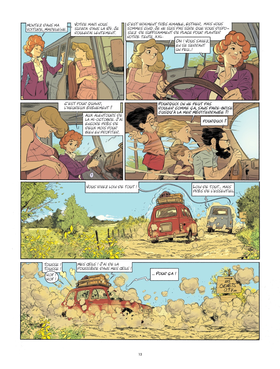 L'histoire : Youpi, c’est les vacances ! Adieu Mons, bonjour le soleil ! Comme tous les ans, la tribu des Faldérault prend la direction du Sud à bord de Mam’Zelle Estérel, la 4L familiale. Pierre n’a pas terminé son album ? Pas grave, il bouclera les dernières planches au bord de la Méditerranée. Les voilà tous les cinq partis pour ne rien faire. Enfin, cinq et demi plutôt, puisque Mado est enceinte. Mais sur la route, patatras. Un camion les double, il perd son chargement et voilà le pare-brise d’Estérel qui vole en éclats. Plus de peur que de mal, mais impossible de continuer. Pendant que le garagiste répare la 4L, la famille est hébergée par Esther et Estelle, deux femmes charmantes qui tiennent la ferme « Les Genêts ». Tandis que Pierre se prend pour Cézanne et que Mado regarde le bébé pousser, les enfants aident à sortir les chèvres et découvrent les charmes de la campagne. Mais ils apprennent aussi les secrets de la vie…